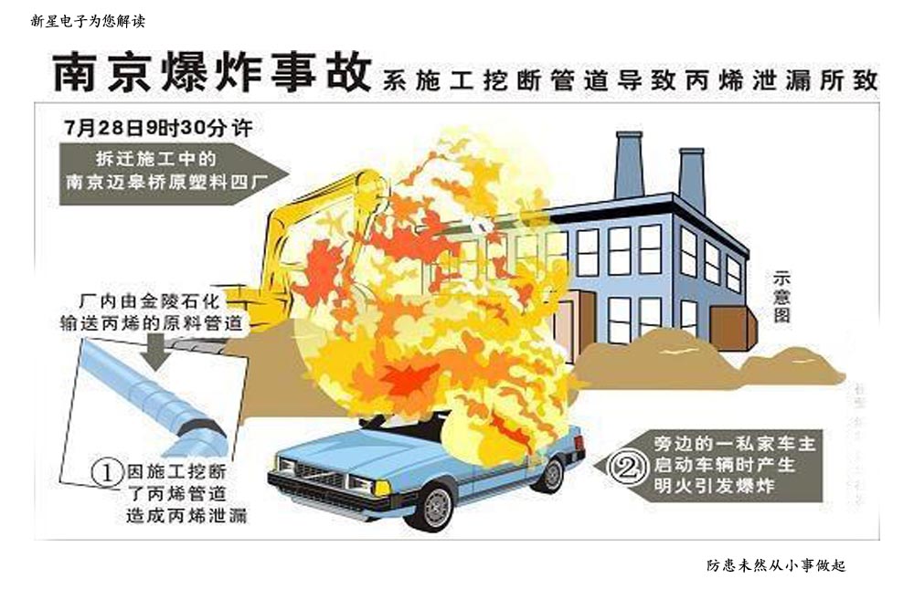 事故原因現(xiàn)已初步查明,施工人員在原南京塑料四廠廠區(qū)場(chǎng)地平整施工中,挖掘機(jī)械違規(guī)碰裂地下丙烯管線,造成丙烯泄漏,與空氣形成 爆炸性混合物,遇明火后發(fā)生爆燃。